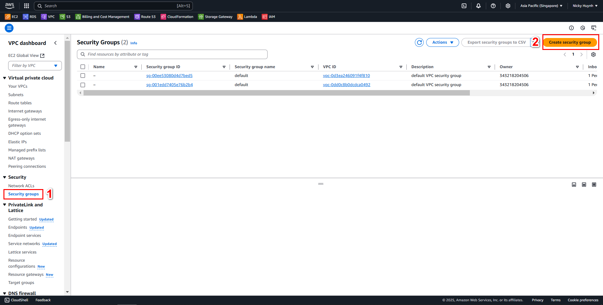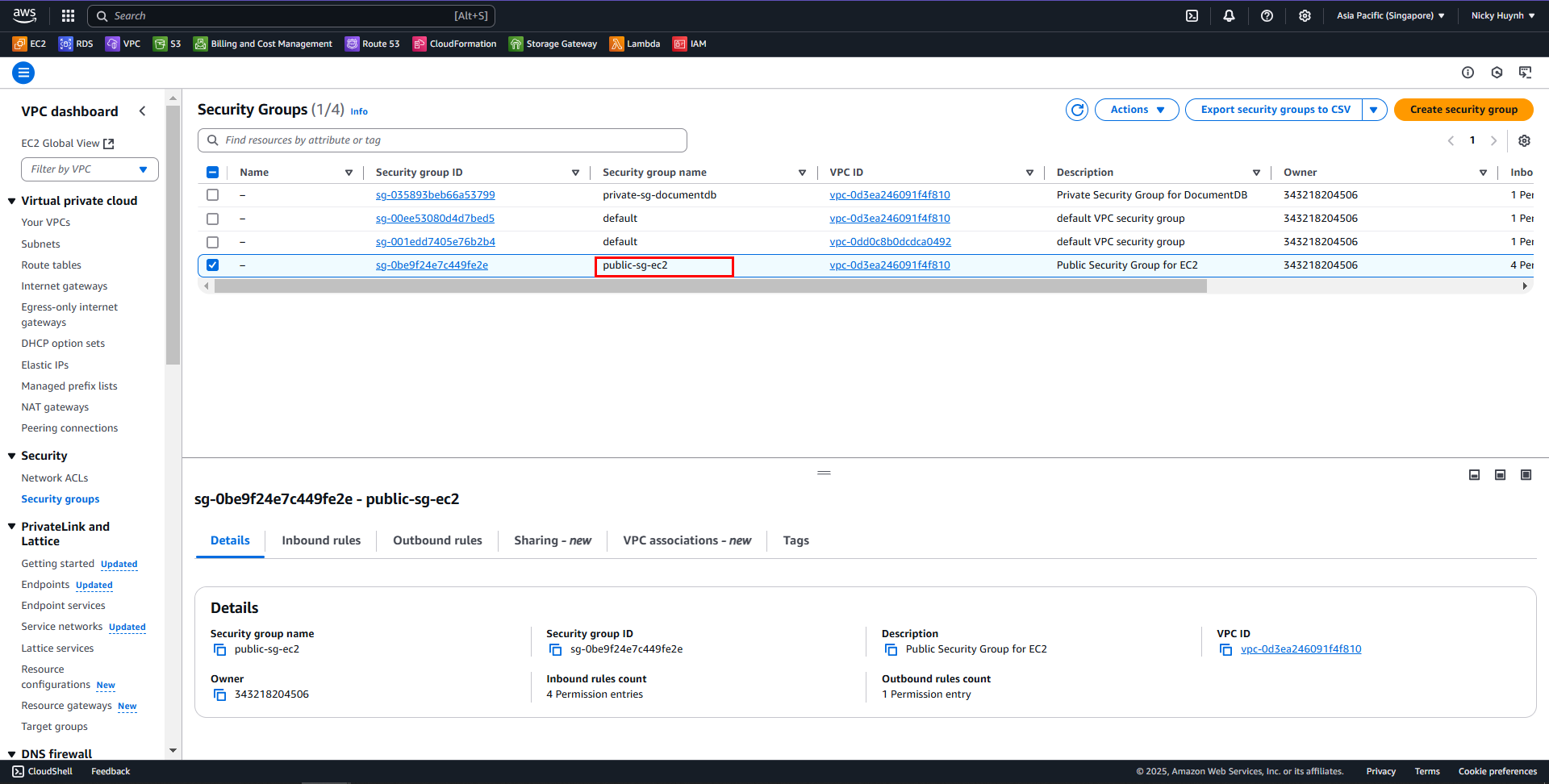 In this step, we will create two Security Groups (SGs): one for public subnets (used by EC2 instances) and one for private subnets (DocumentDB)
