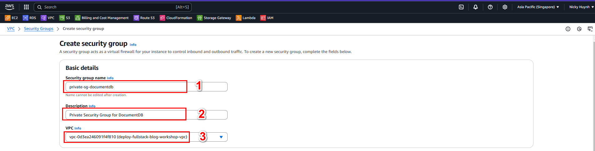 | Custom TCP | 27017 | SG-Private-DocumentDB | Cho phép EC2 kết nối DocumentDB |